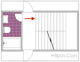 厕所的门正对着上下的楼梯,楼梯是气场流动所在,气直冲厕所内,引起厕所气场不稳,会使秽气流出,以致流至阳宅各处,会影响家人之健康和运势。