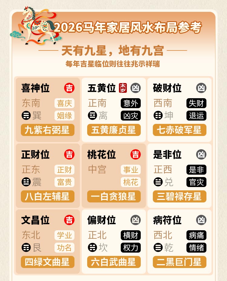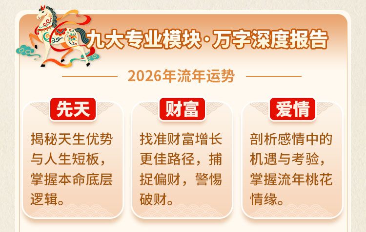 2026年为丙午马年,天干地支形成“离火双叠”之象,正式步入九紫离火运的旺盛阶段。本测算四大体系深度交织,为你透视全年运势脉络:以紫微斗数为经,从命宫身宫切入,结合星曜排布,解读“天垂象”中隐藏的机遇与警示;以生辰八字为纬,立足先天格局与十神配置,析辨丙午火旺之年对事业、情感、健康的生克影响;以九宫飞星为络,依据流年星曜飞宫,联动方位与气运,借势吉位,化解隐忧;以流年十二宫为鉴,对应各生肖吉凶临照,解读太岁关系,论断事业、财富、人际、健康、是非等事项。