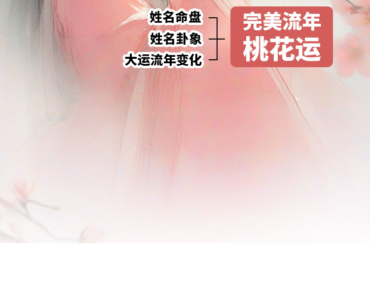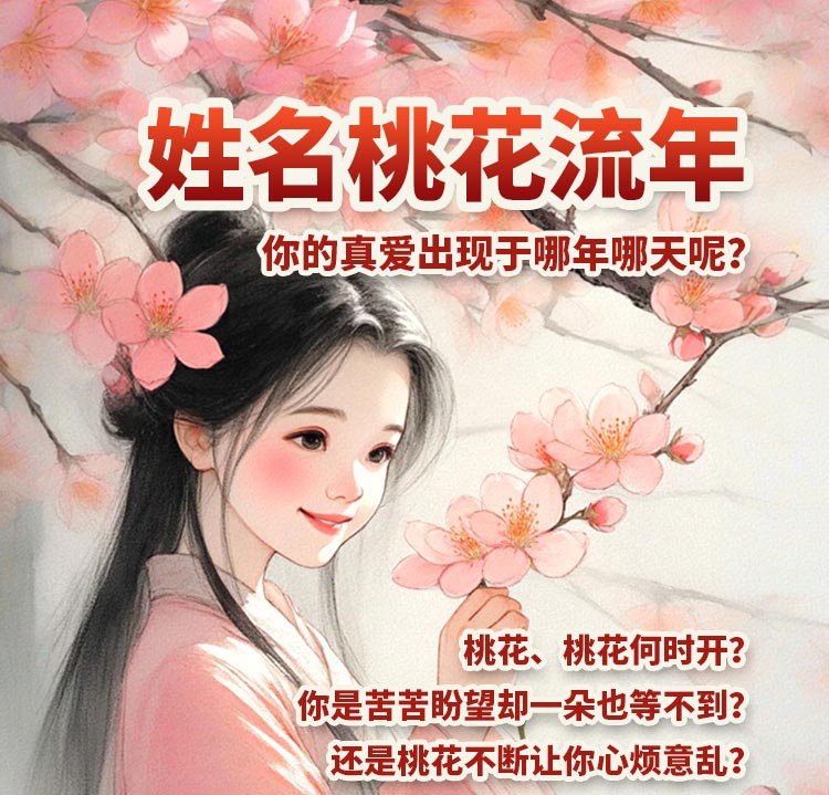 【姓名桃花】从姓名学的角度为你作全盘解析,帮你预测桃花运何时来临,再配合流年的变化,看你的桃花流年、大运流年,能枯准的提供您流年爱告运势及真爱相通的时机预测,让你在感话的世界里不再频频回顾。